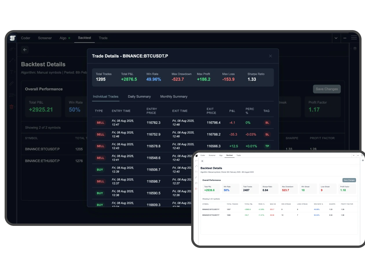 Backtest your strategies with historical market data to trade smarter and more confidently. Simulate trades in real conditions, analyze performance, and validate ideas before going live. Identify strengths and weaknesses in your approach with detailed reports. Fine-tune parameters for maximum efficiency and profitability. Reduce risk by testing thoroughly before committing real capital. Gain valuable insights into market behavior and trading patterns. Build confidence and consistency by proving your strategies before execution.